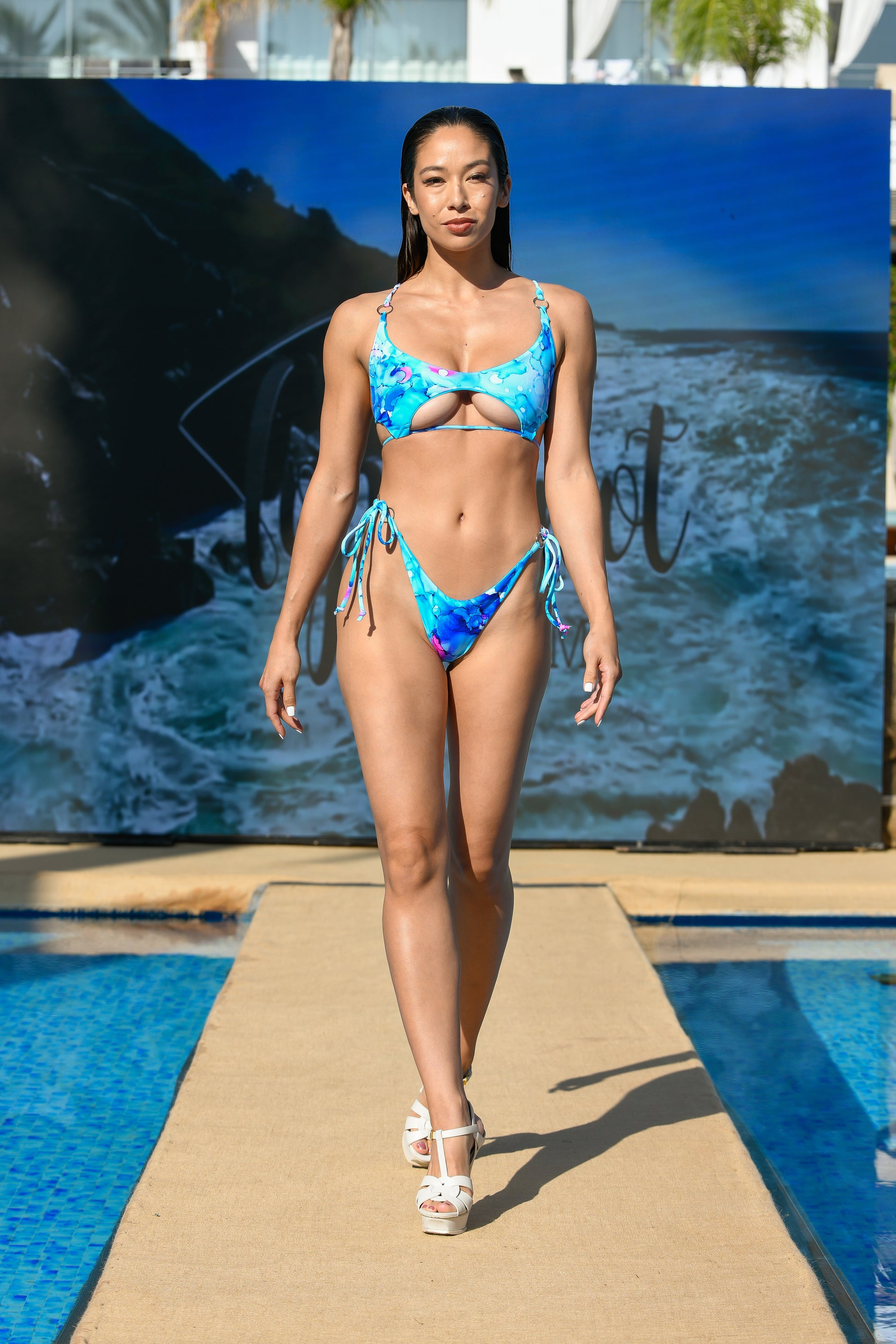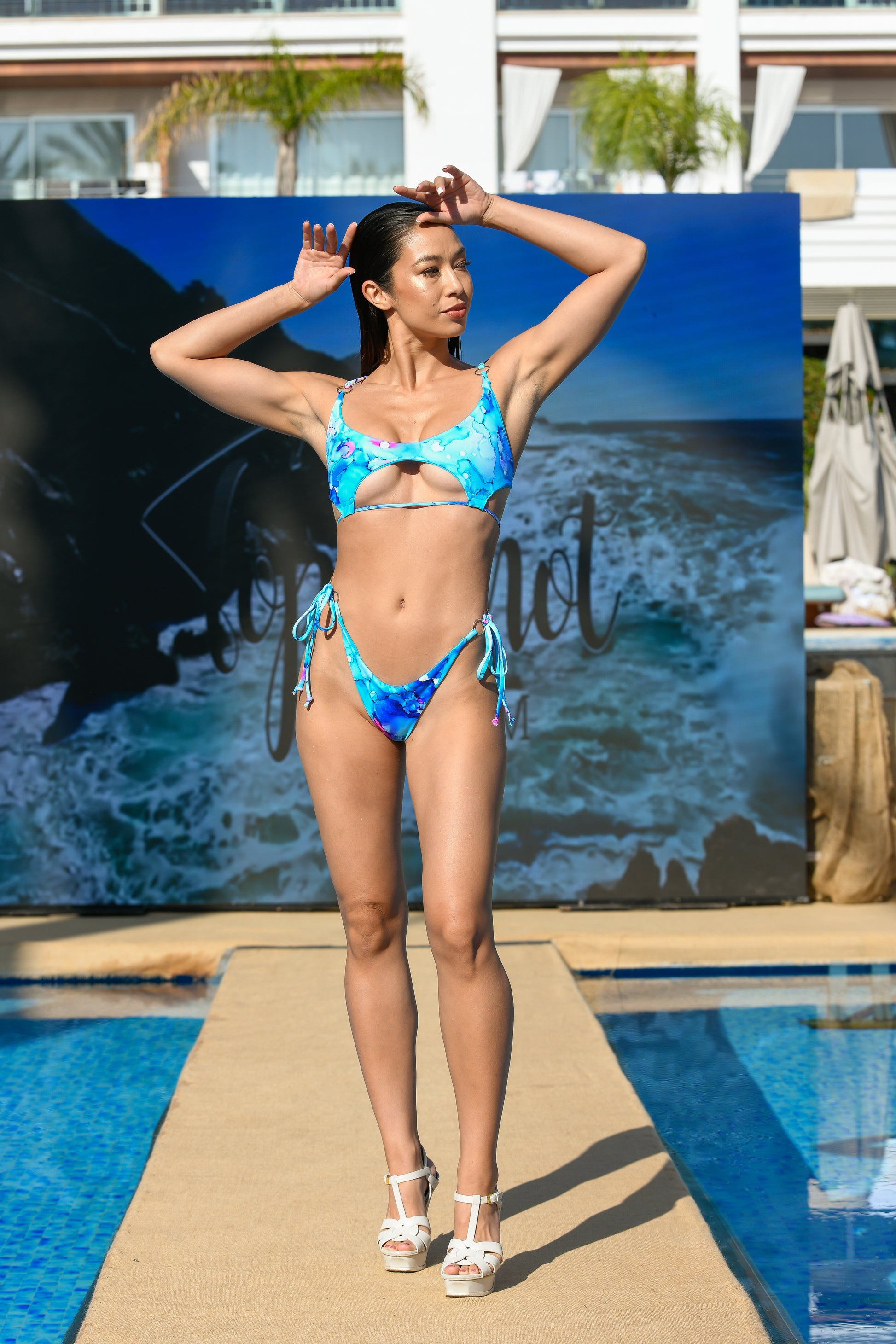 The top has a key hole front cut out with a seamless finish. This swimsuit is reversible with a criss cross back.